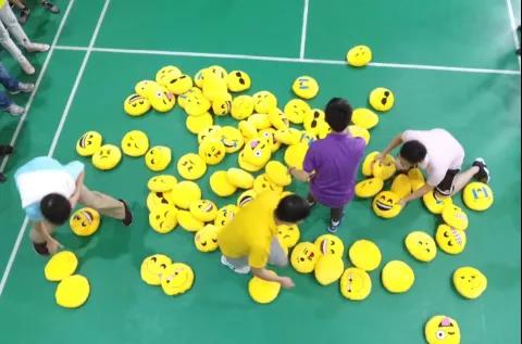 地面上放滿表情包枕,運動員們按照教練的指示尋找、搶奪枕頭;每輪每隊派出5人參賽。